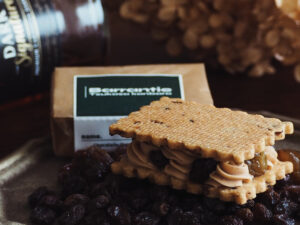 きび砂糖とダークラムでじっくり漬け込んだ カリフォルニアレーズンとサンマスカットレーズンの2種を使用。 自家製ラムレーズンペーストを練り込んだクッキーに Barrantieのキャラメルスプレッドを使用した バタークリームと2種のレーズンをたっぷりサンドしました。